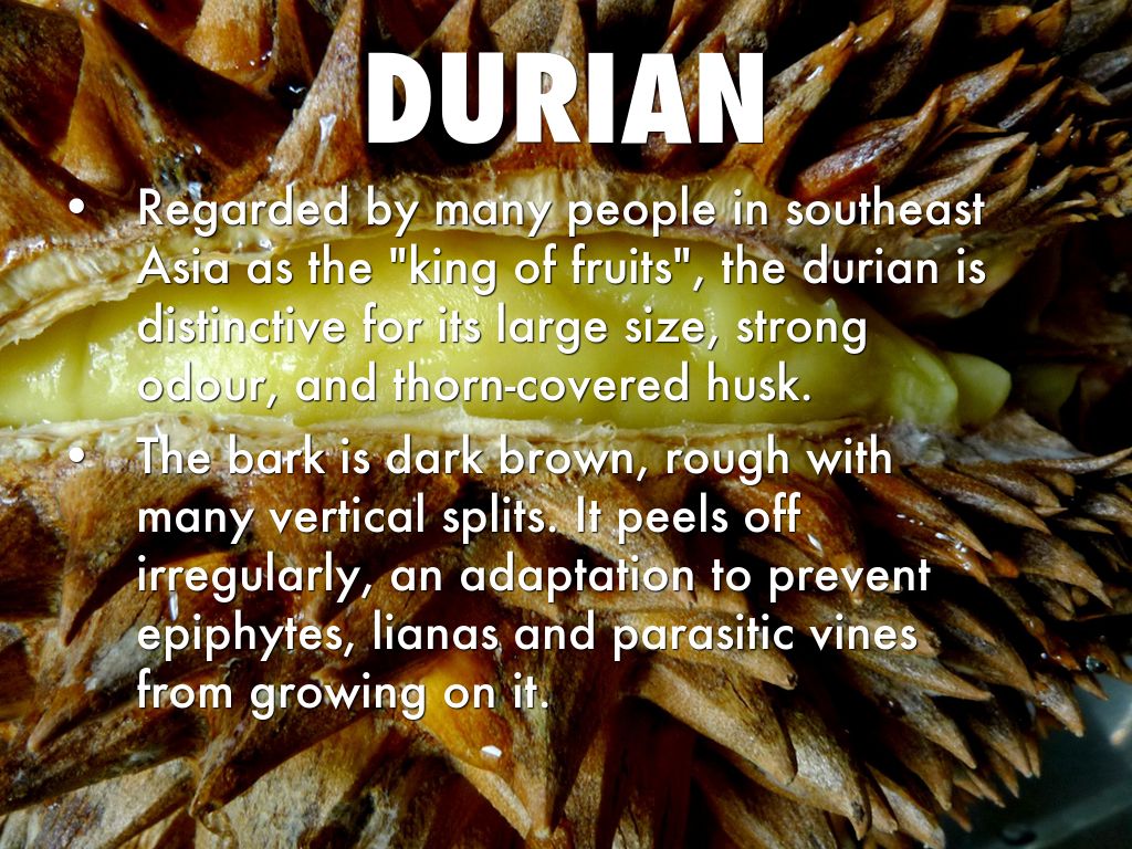 Regarded by many people in southeast Asia as the "king of fruits", the durian is distinctive for its large size, strong odour, and thorn-covered husk.