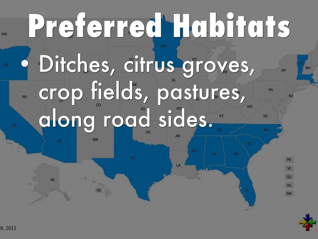 Ditches, citrus groves, crop fields, pastures, along road sides.
