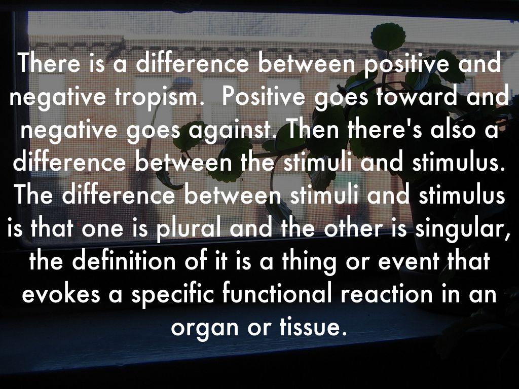 There is a difference between positive and negative tropism. Positive goes toward and negative goes against. Then there's also a difference between the stimuli and stimulus. The difference between stimuli and stimulus is that one is plural and the other is singular, the definition of it is a thing or event that evokes a specific functional reaction in an organ or tissue.
