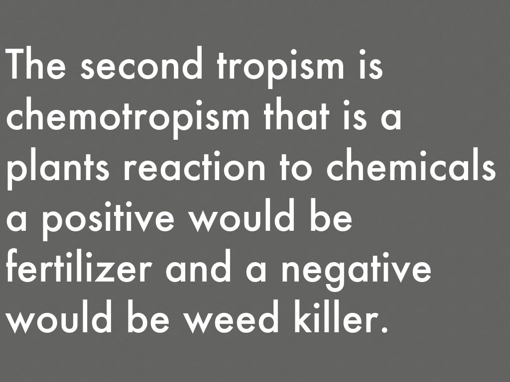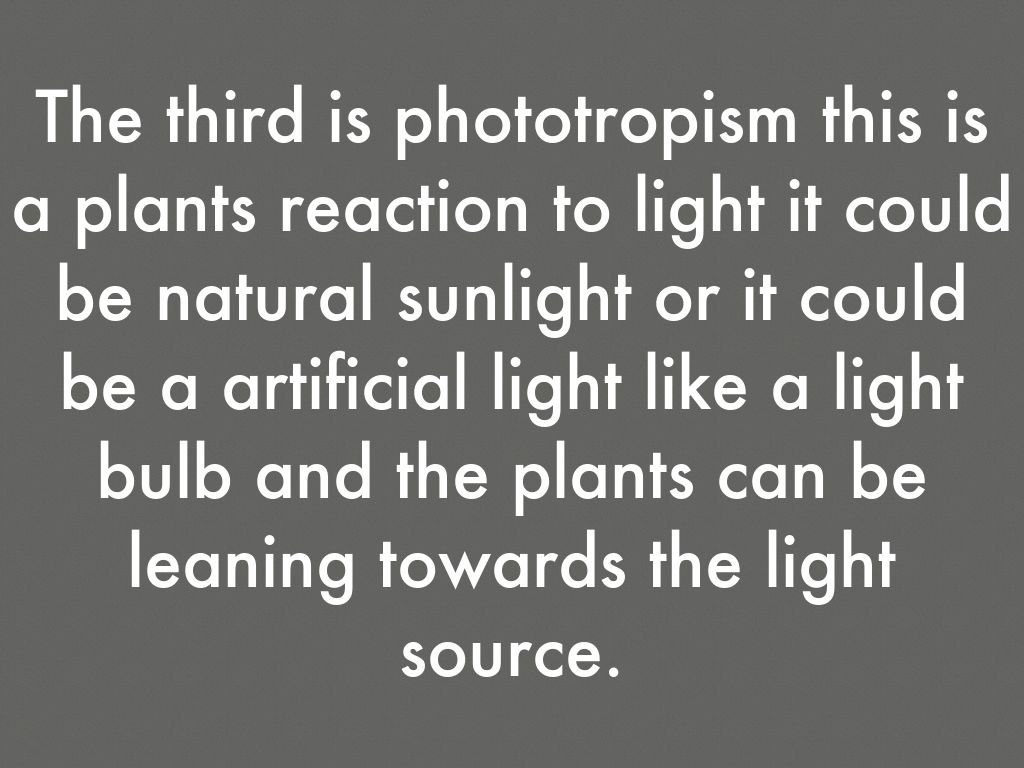 The third is phototropism this is a plants reaction to light it could be natural sunlight or it could be a artificial light like a light bulb and the plants can be leaning towards the light source.