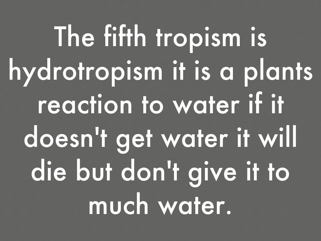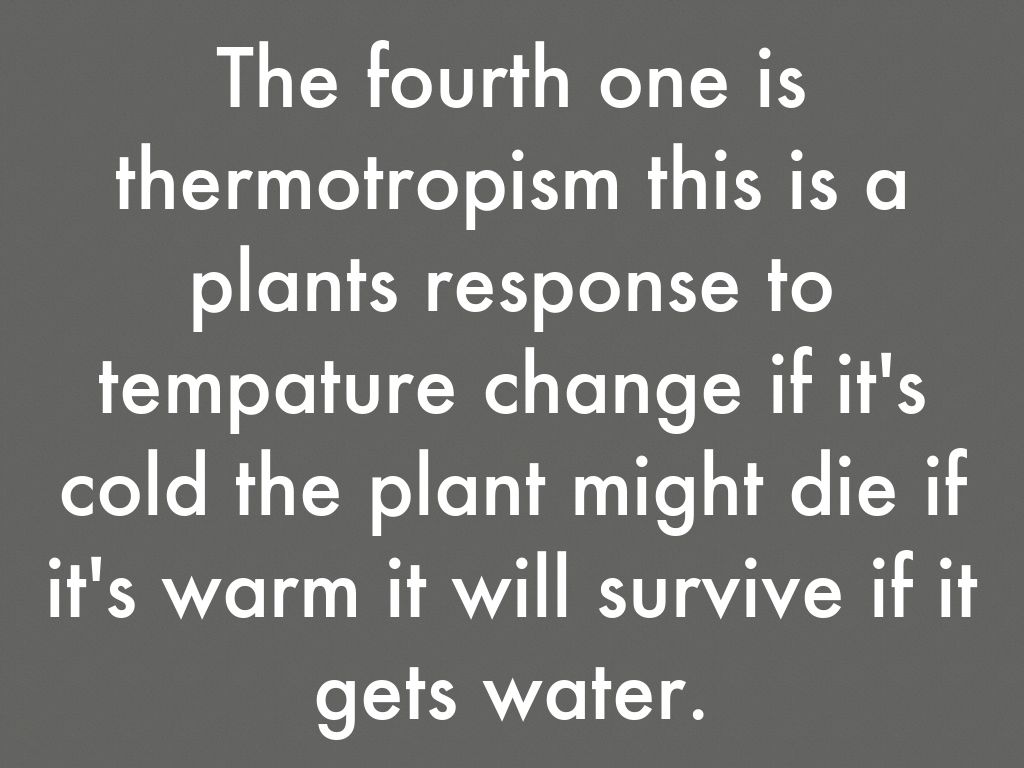 The fourth one is thermotropism this is a plants response to tempature change if it's cold the plant might die if it's warm it will survive if it gets water.