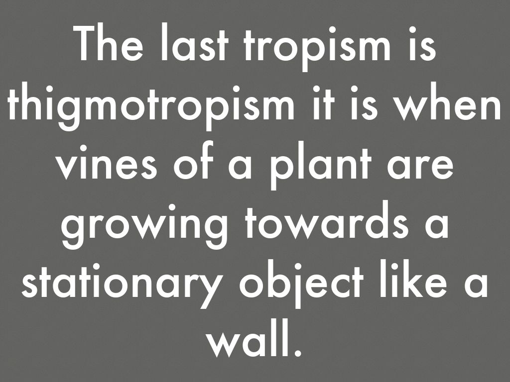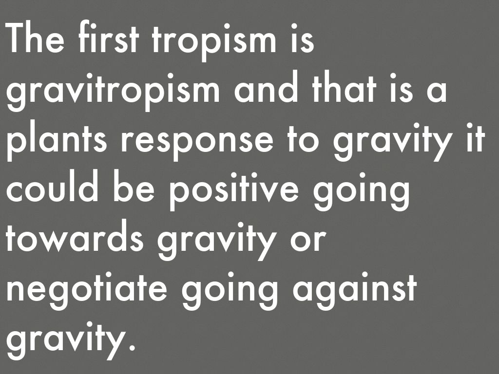 The first tropism is gravitropism and that is a plants response to gravity it could be positive going towards gravity or negotiate going against gravity.