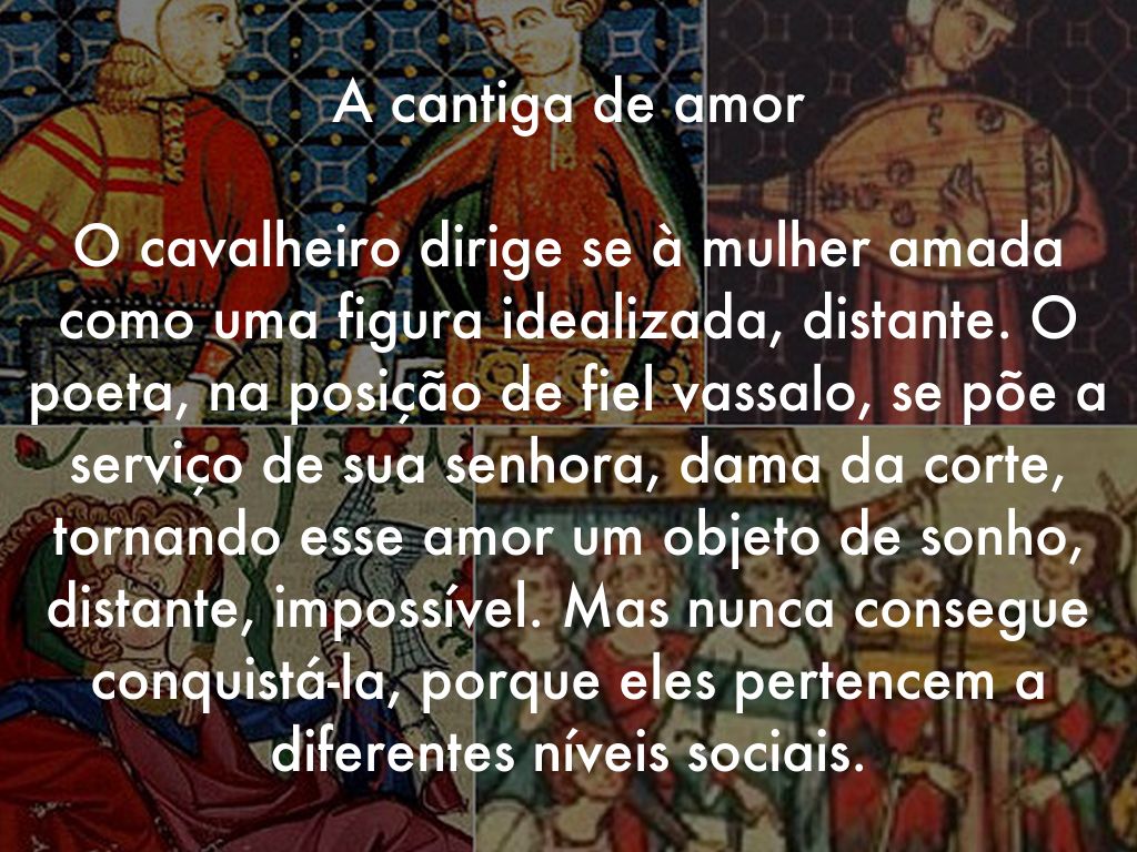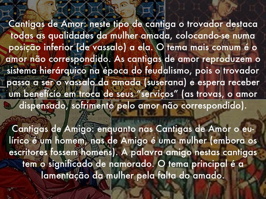 Cantigas de Amor: neste tipo de cantiga o trovador destaca todas as qualidades da mulher amada, colocando-se numa posição inferior (de vassalo) a ela. O tema mais comum é o amor não correspondido. As cantigas de amor reproduzem o sistema hierárquico na época do feudalismo, pois o trovador passa a ser o vassalo da amada (suserana) e espera receber um benefício em troca de seus “serviços” (as trovas, o amor dispensado, sofrimento pelo amor não correspondido).