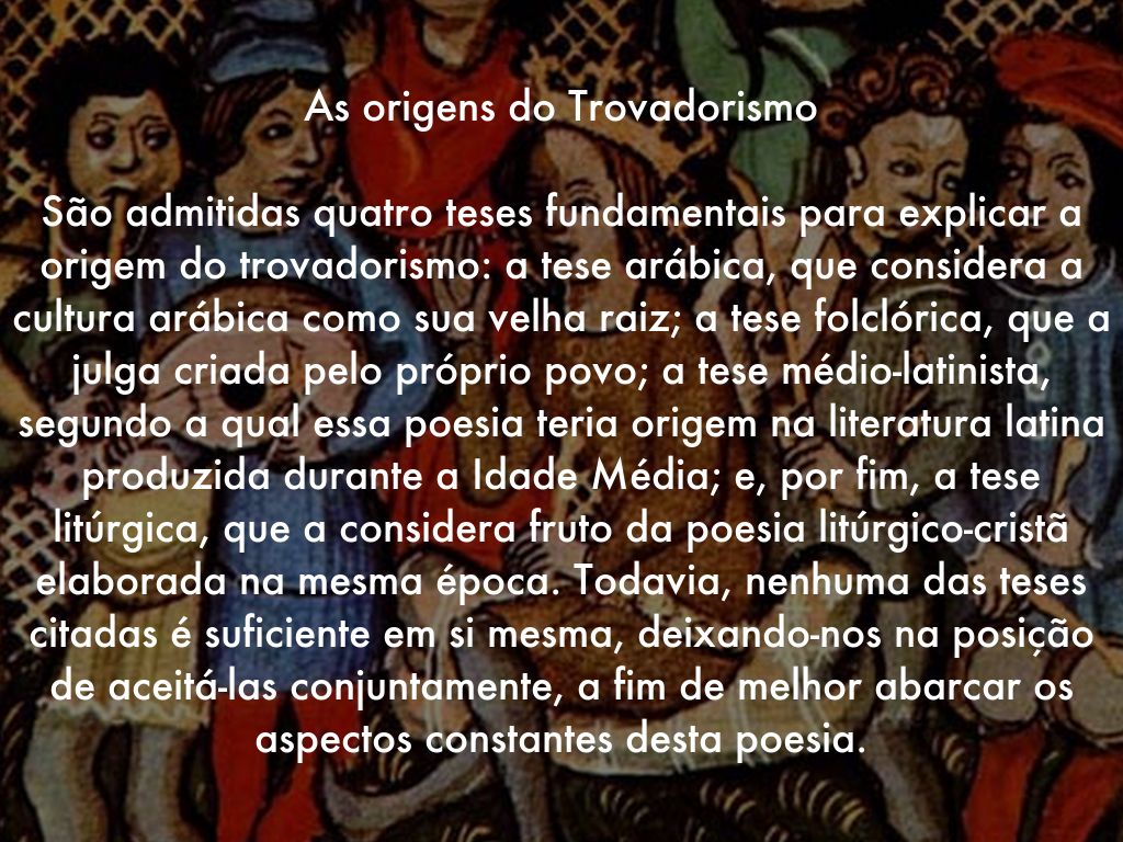 São admitidas quatro teses fundamentais para explicar a origem do trovadorismo: a tese arábica, que considera a cultura arábica como sua velha raiz; a tese folclórica, que a julga criada pelo próprio povo; a tese médio-latinista, segundo a qual essa poesia teria origem na literatura latina produzida durante a Idade Média; e, por fim, a tese litúrgica, que a considera fruto da poesia litúrgico-cristã elaborada na mesma época. Todavia, nenhuma das teses citadas é suficiente em si mesma, deixando-nos na posição de aceitá-las conjuntamente, a fim de melhor abarcar os aspectos constantes desta poesia.