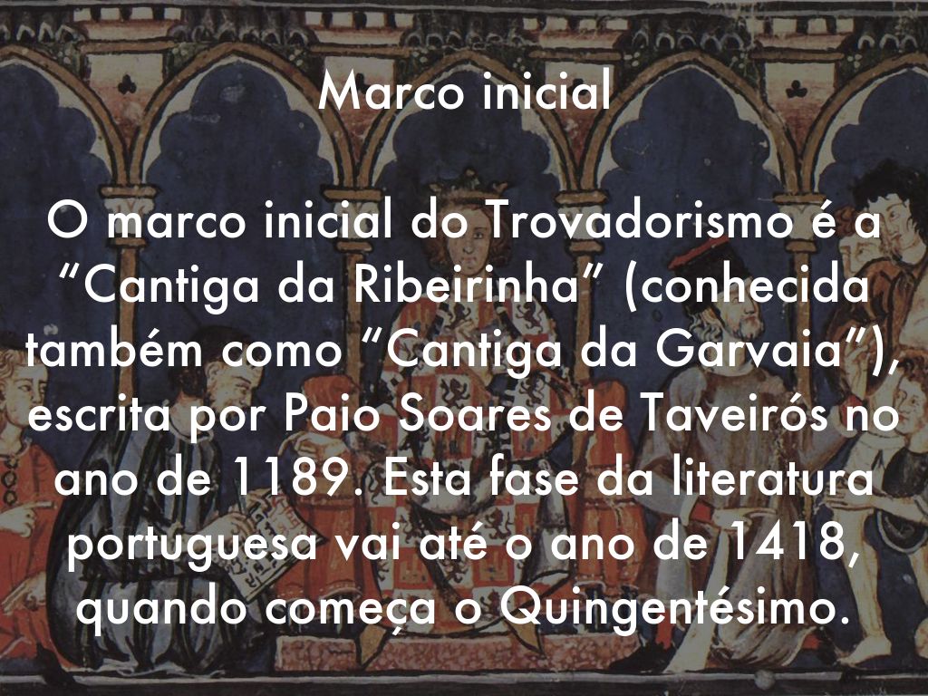 O marco inicial do Trovadorismo é a “Cantiga da Ribeirinha” (conhecida também como “Cantiga da Garvaia”), escrita por Paio Soares de Taveirós no ano de 1189. Esta fase da literatura portuguesa vai até o ano de 1418, quando começa o Quingentésimo.