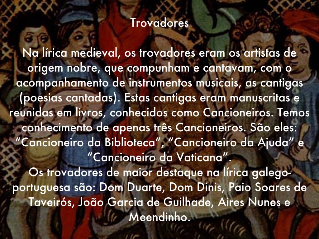 Na lírica medieval, os trovadores eram os artistas de origem nobre, que compunham e cantavam, com o acompanhamento de instrumentos musicais, as cantigas (poesias cantadas). Estas cantigas eram manuscritas e reunidas em livros, conhecidos como Cancioneiros. Temos conhecimento de apenas três Cancioneiros. São eles: “Cancioneiro da Biblioteca”, “Cancioneiro da Ajuda” e “Cancioneiro da Vaticana”.