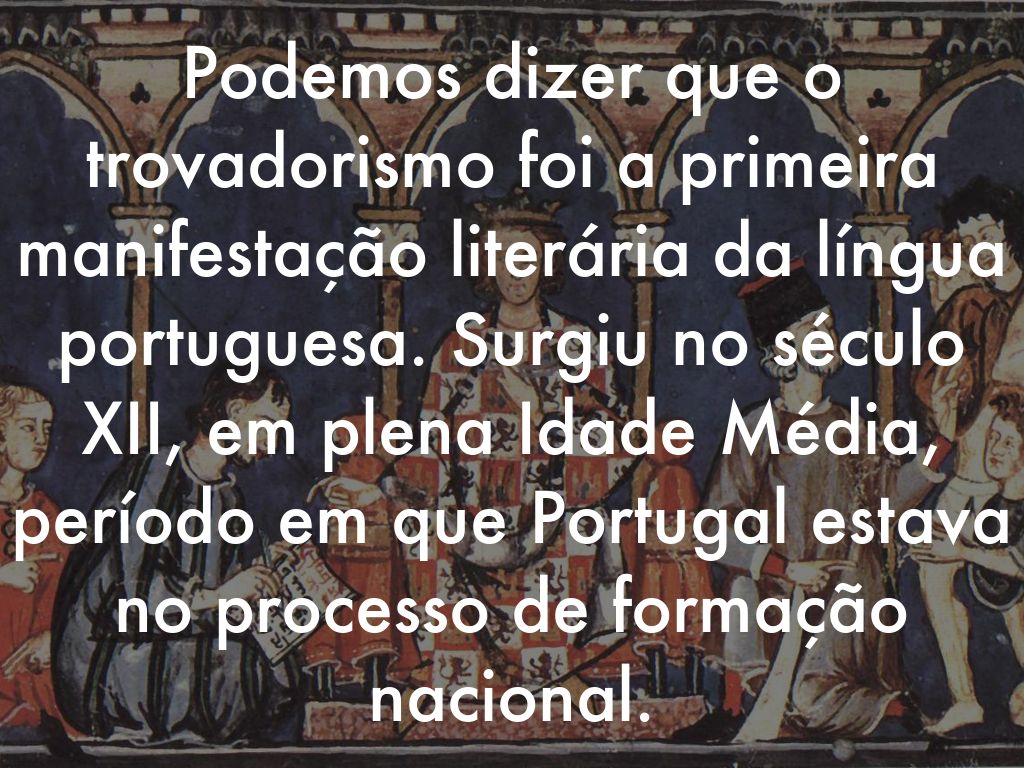 Podemos dizer que o trovadorismo foi a primeira manifestação literária da língua portuguesa. Surgiu no século XII, em plena Idade Média, período em que Portugal estava no processo de formação nacional.