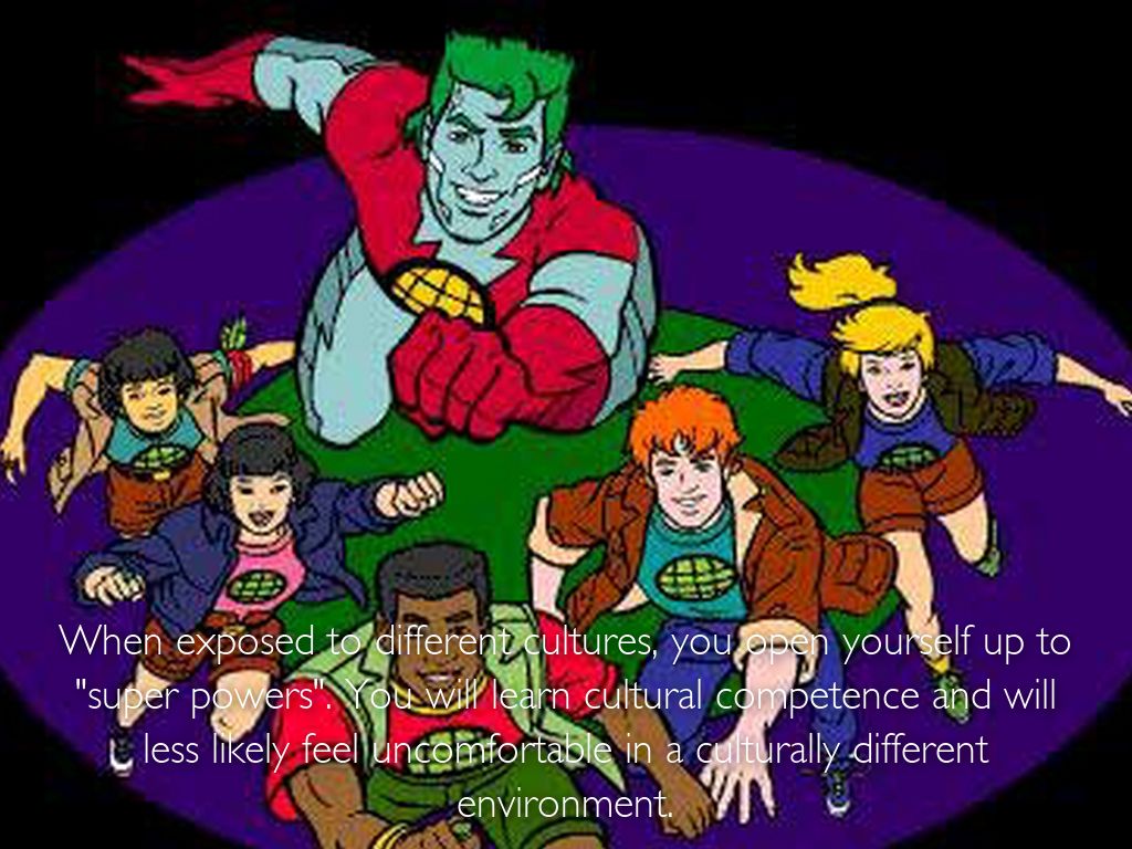 When exposed to different cultures, you open yourself up to "super powers". You will learn cultural competence and will less likely feel uncomfortable in a culturally different environment.