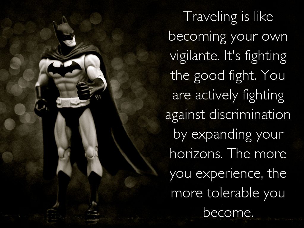 Traveling is like becoming your own vigilante. It's fighting the good fight. You are actively fighting against discrimination by expanding your horizons. The more you experience, the more tolerable you become.