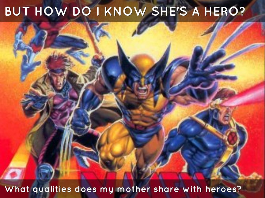 We know now what makes a super hero. But when in real life, how do those qualities apply to heroes? What makes my mom a hero? How is she different from all the other moms in the world? Does my mother fight supervillains? No, she does not. Then how is my mother like Storm, Jean Grey, Wolverine and all the heroes you read about in comic books? How could I possibly compare her to mythical and fictional men and women that always save the day?