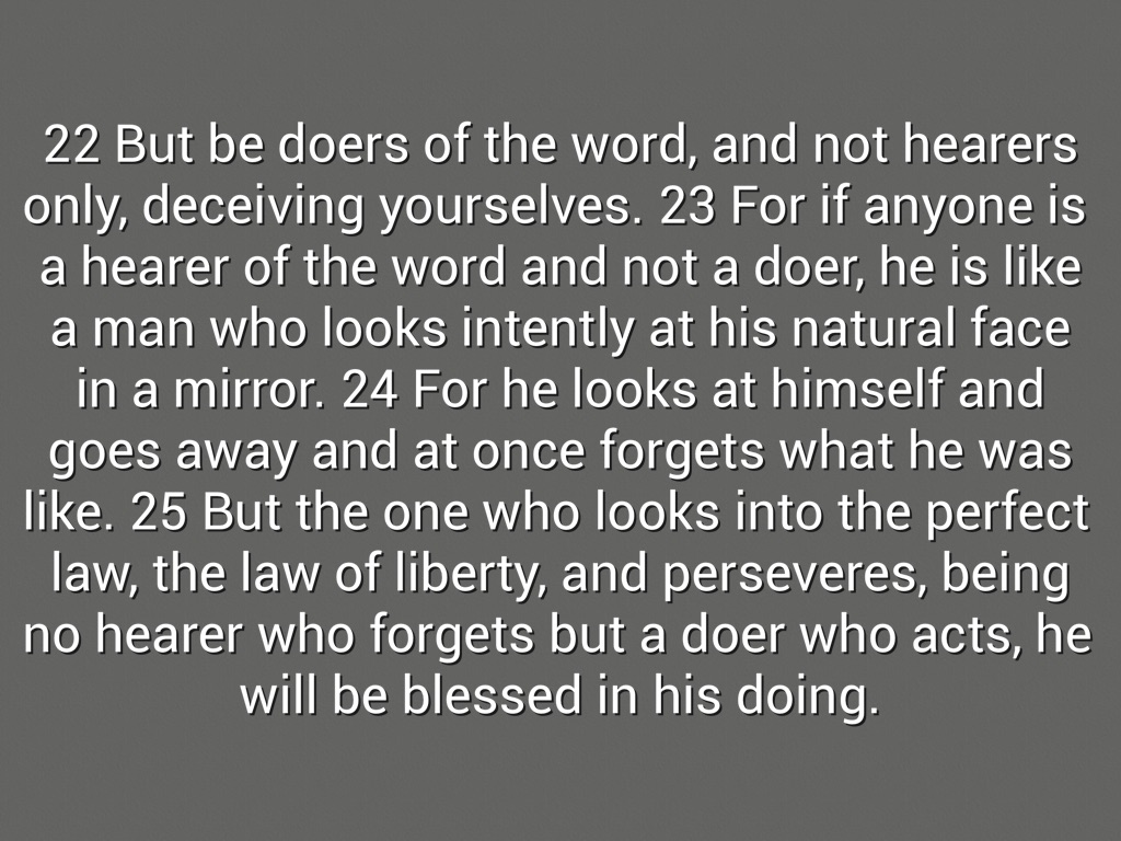 22 But be doers of the word, and not hearers only, deceiving yourselves. 23 For if anyone is a hearer of the word and not a doer, he is like a man who looks intently at his natural face in a mirror. 24 For he looks at himself and goes away and at once forgets what he was like. 25 But the one who looks into the perfect law, the law of liberty, and perseveres, being no hearer who forgets but a doer who acts, he will be blessed in his doing.