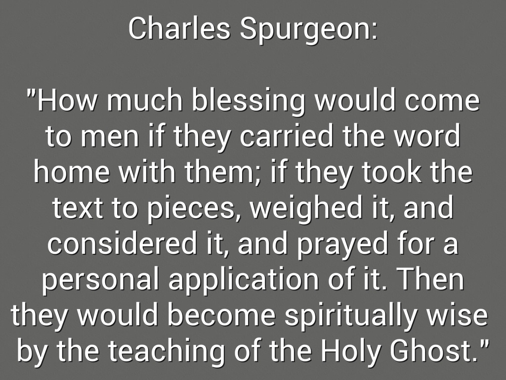 "How much blessing would come to men if they carried the word home with them; if they took the text to pieces, weighed it, and considered it, and prayed for a personal application of it. Then they would become spiritually wise by the teaching of the Holy Ghost."