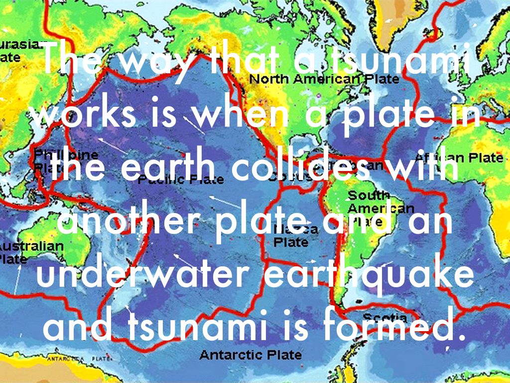 The way that a tsunami works is when a plate in the earth collides with another plate and an underwater earthquake and tsunami is formed.