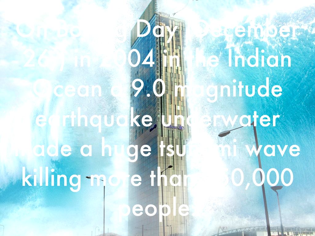 On Boxing Day (December 26,) in 2004 in the Indian Ocean a 9.0 magnitude earthquake underwater made a huge tsunami wave killing more than 250,000 people.
