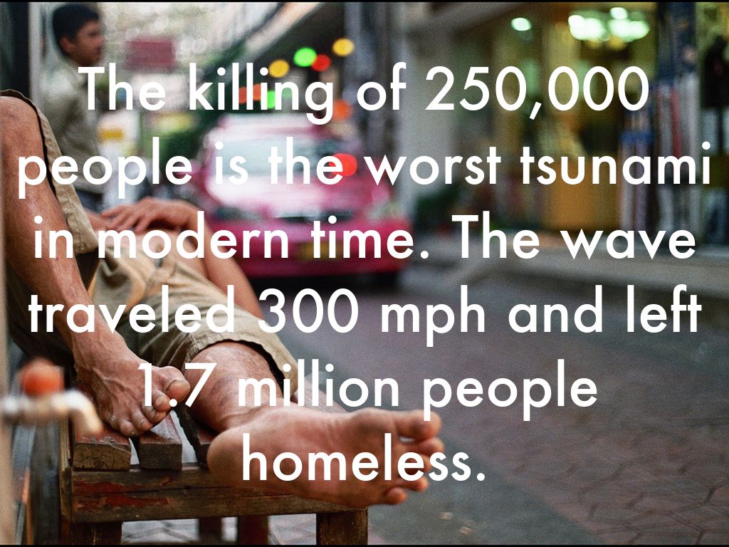 The killing of 250,000 people is the worst tsunami in modern time. The wave traveled 300 mph and left 1.7 million people homeless.