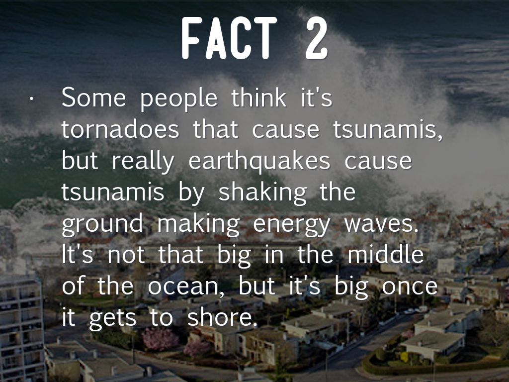 Some people think it's tornadoes that cause tsunamis, but really earthquakes cause tsunamis by shaking the ground making energy waves. It's not that big in the middle of the ocean, but it's big once it gets to shore.