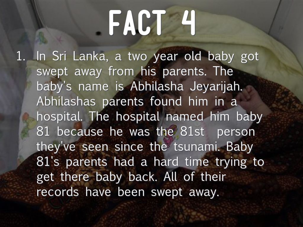 In Sri Lanka, a two year old baby got swept away from his parents. The baby's name is Abhilasha Jeyarijah. Abhilashas parents found him in a hospital. The hospital named him baby 81 because he was the 81st person they've seen since the tsunami. Baby 81's parents had a hard time trying to get there baby back. All of their records have been swept away.