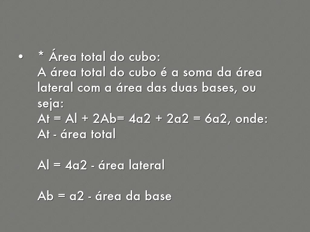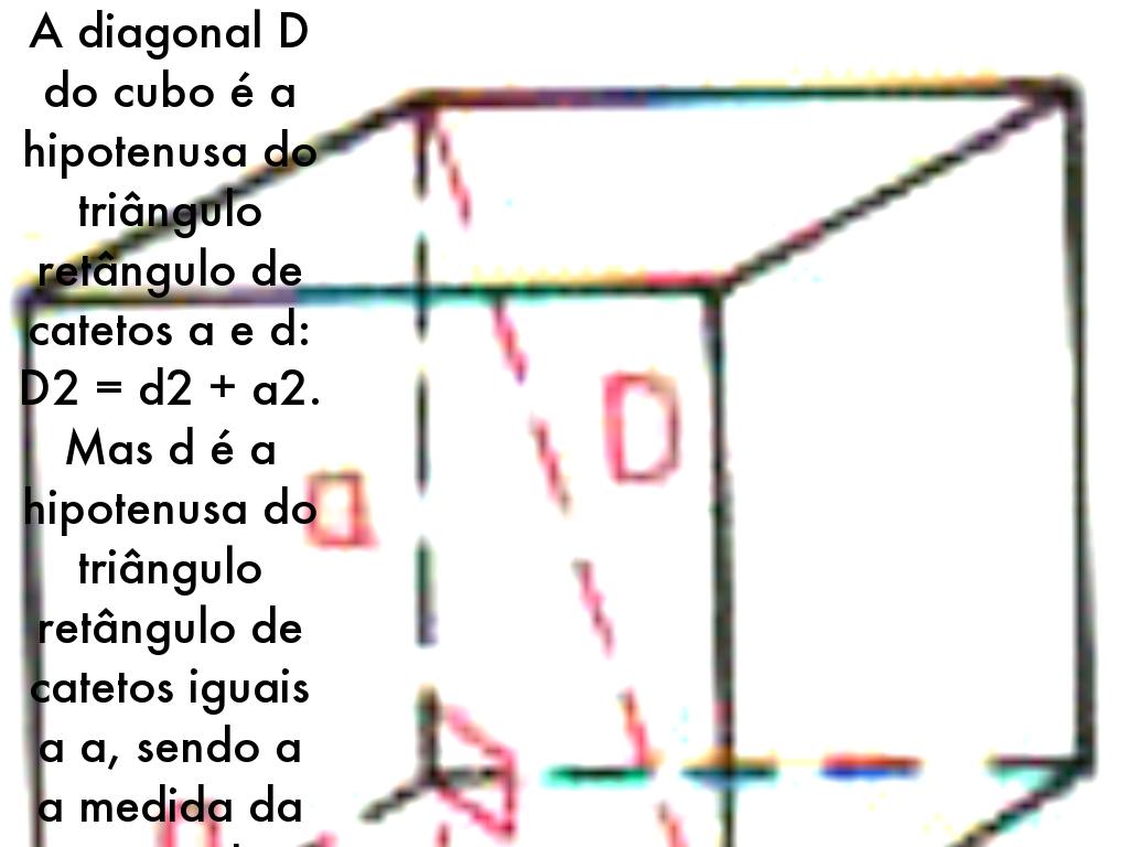A diagonal D do cubo é a hipotenusa do triângulo retângulo de catetos a e d: D2 = d2 + a2. Mas d é a hipotenusa do triângulo retângulo de catetos iguais a a, sendo a a medida da aresta do cubo, logo, d2 = a2 + a2, ou seja, d2 = 2a2. Então, D2 = 2a2 + a2 = 3a2, donde temos que o comprimento da diagonal do cubo é dada por D = .
