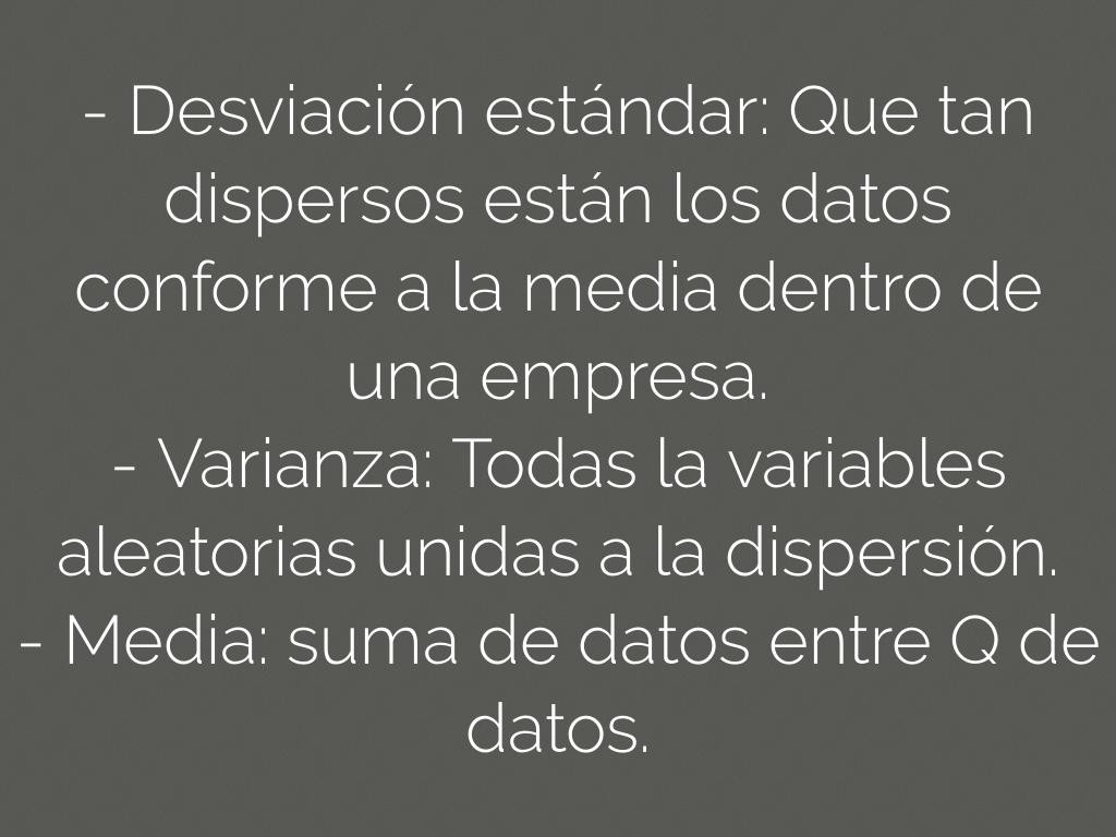 - Desviación estándar: Que tan dispersos están los datos conforme a la media dentro de una empresa.