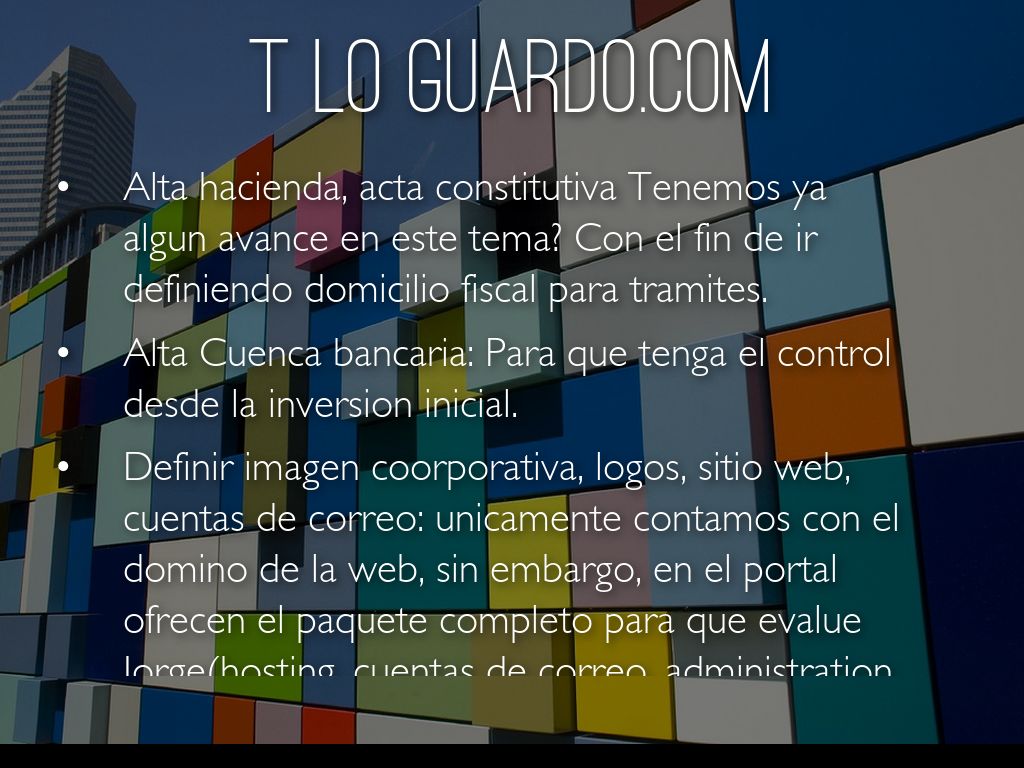 • Definir imagen coorporativa, logos, sitio web, cuentas de correo: unicamente contamos con el domino de la web, sin embargo, en el portal ofrecen el paquete completo para que evalue Jorge(hosting, cuentas de correo, administration de la pagina, etc)