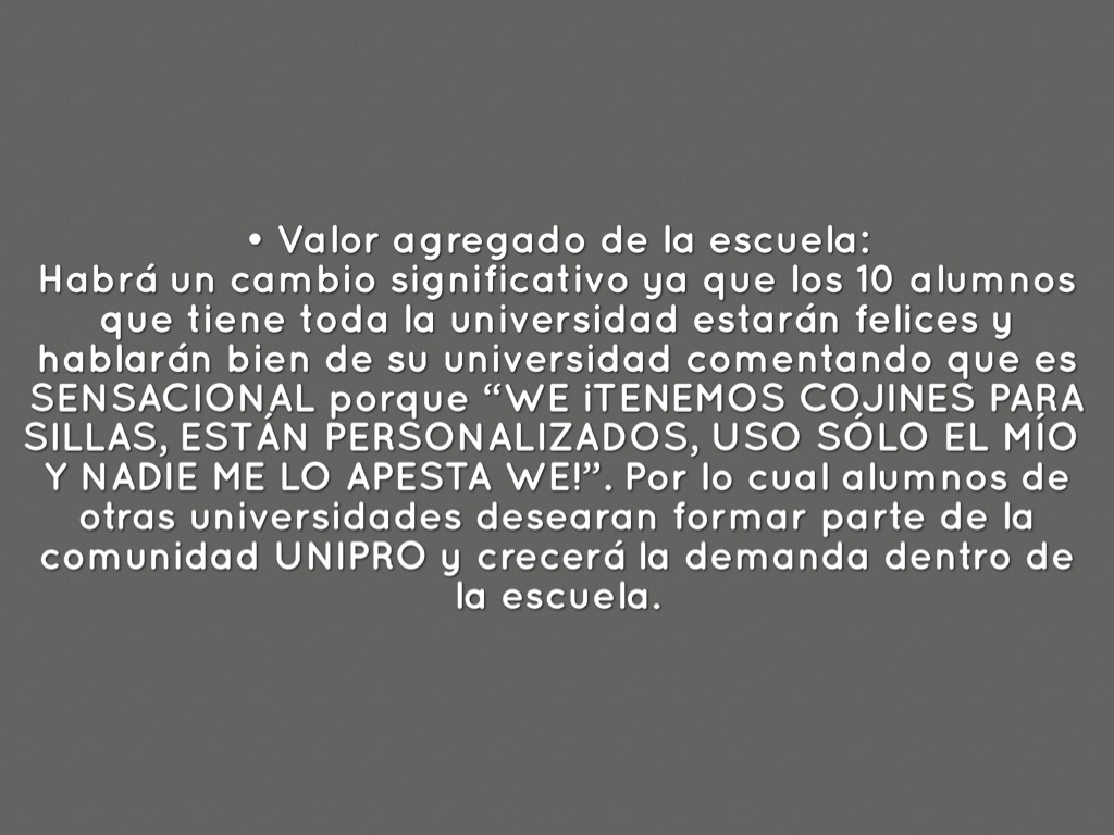 Habrá un cambio significativo ya que los 10 alumnos que tiene toda la universidad estarán felices y hablarán bien de su universidad comentando que es SENSACIONAL porque “WE ¡TENEMOS COJINES PARA SILLAS, ESTÁN PERSONALIZADOS, USO SÓLO EL MÍO Y NADIE ME LO APESTA WE!”. Por lo cual alumnos de otras universidades desearan formar parte de la comunidad UNIPRO y crecerá la demanda dentro de la escuela.