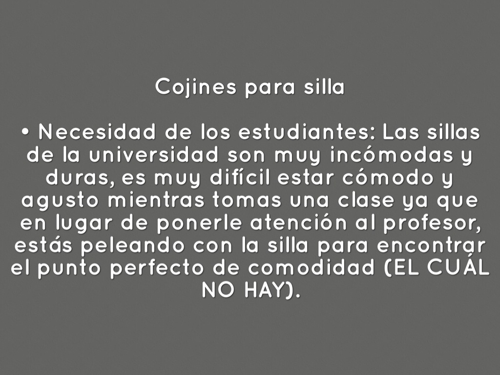 • Necesidad de los estudiantes: Las sillas de la universidad son muy incómodas y duras, es muy difícil estar cómodo y agusto mientras tomas una clase ya que en lugar de ponerle atención al profesor, estás peleando con la silla para encontrar el punto perfecto de comodidad (EL CUÁL NO HAY).