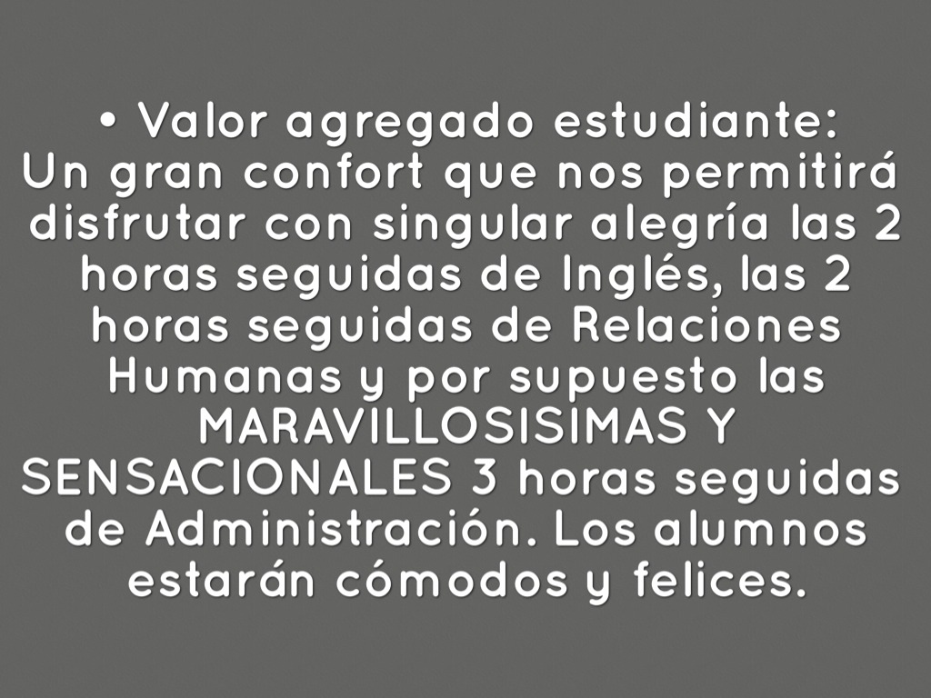 Un gran confort que nos permitirá disfrutar con singular alegría las 2 horas seguidas de Inglés, las 2 horas seguidas de Relaciones Humanas y por supuesto las MARAVILLOSISIMAS Y SENSACIONALES 3 horas seguidas de Administración. Los alumnos estarán cómodos y felices.