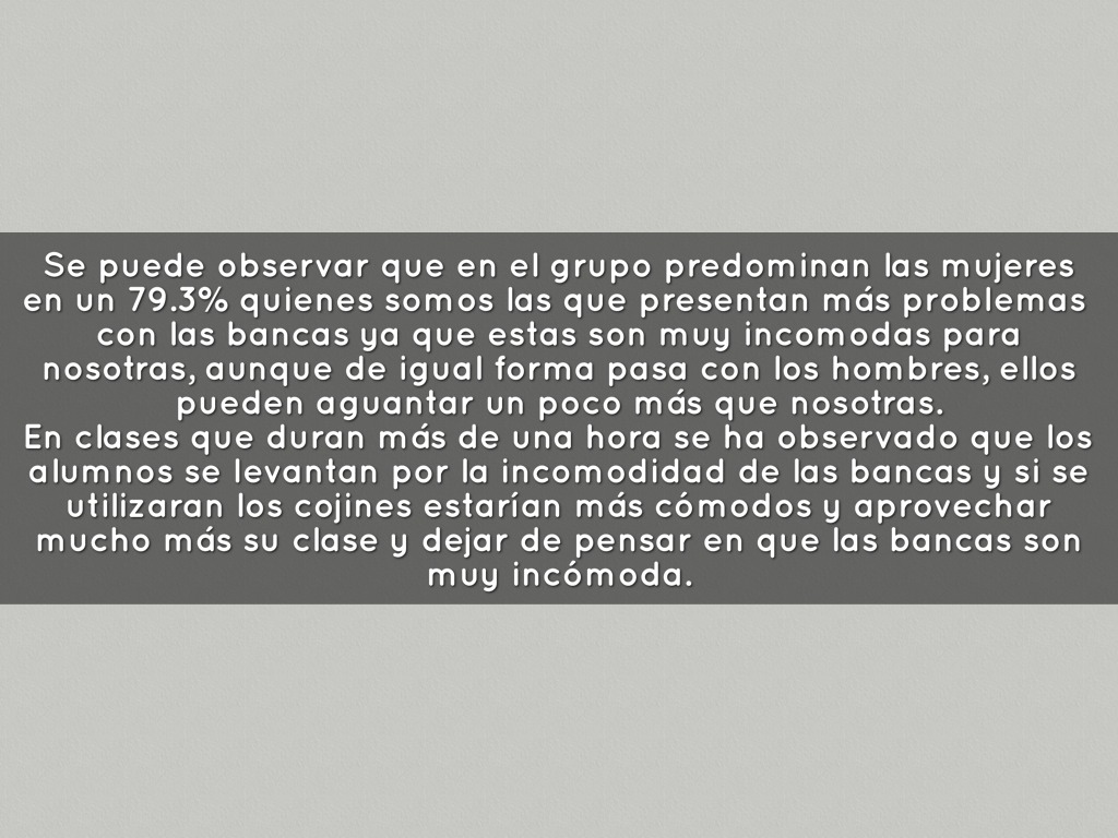 Se puede observar que en el grupo predominan las mujeres en un 79.3% quienes somos las que presentan más problemas con las bancas ya que estas son muy incomodas para nosotras, aunque de igual forma pasa con los hombres, ellos pueden aguantar un poco más que nosotras.