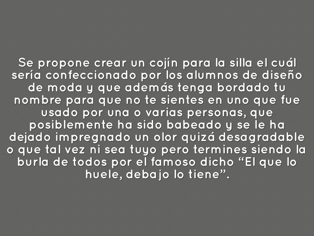 Se propone crear un cojín para la silla el cuál sería confeccionado por los alumnos de diseño de moda y que además tenga bordado tu nombre para que no te sientes en uno que fue usado por una o varias personas, que posiblemente ha sido babeado y se le ha dejado impregnado un olor quizá desagradable o que tal vez ni sea tuyo pero termines siendo la burla de todos por el famoso dicho “El que lo huele, debajo lo tiene”.