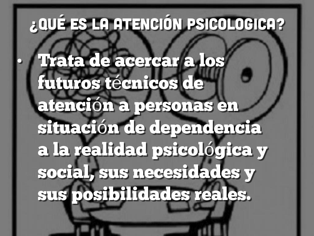 • Trata de acercar a los futuros técnicos de atención a personas en situación de dependencia a la realidad psicológica y social, sus necesidades y sus posibilidades reales.