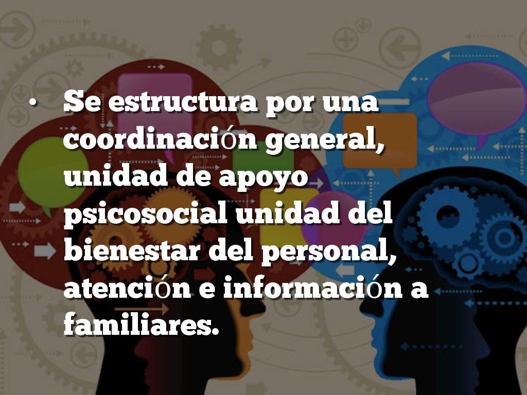 • Se estructura por una coordinación general, unidad de apoyo psicosocial unidad del bienestar del personal, atención e información a familiares.