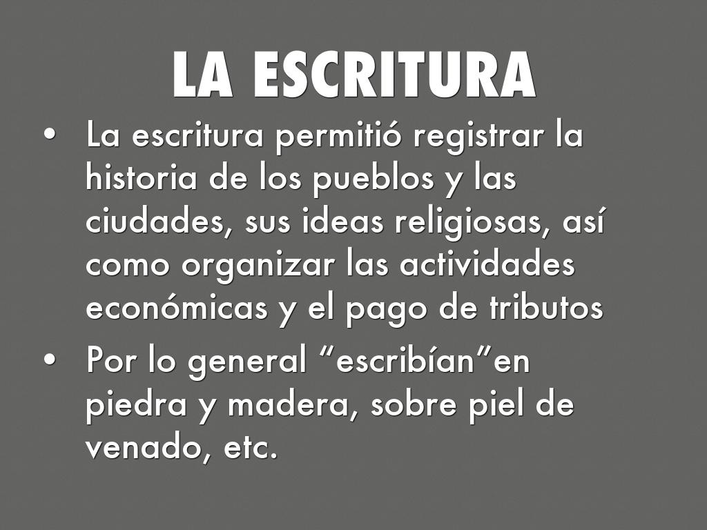 La escritura permitió registrar la historia de los pueblos y las ciudades, sus ideas religiosas, así como organizar las actividades económicas y el pago de tributos