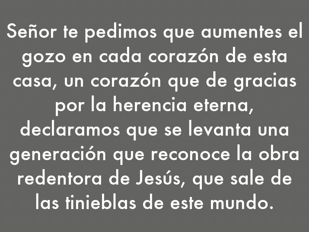 Señor te pedimos que aumentes el gozo en cada corazón de esta casa, un corazón que de gracias por la herencia eterna, declaramos que se levanta una generación que reconoce la obra redentora de Jesús, que sale de las tinieblas de este mundo.