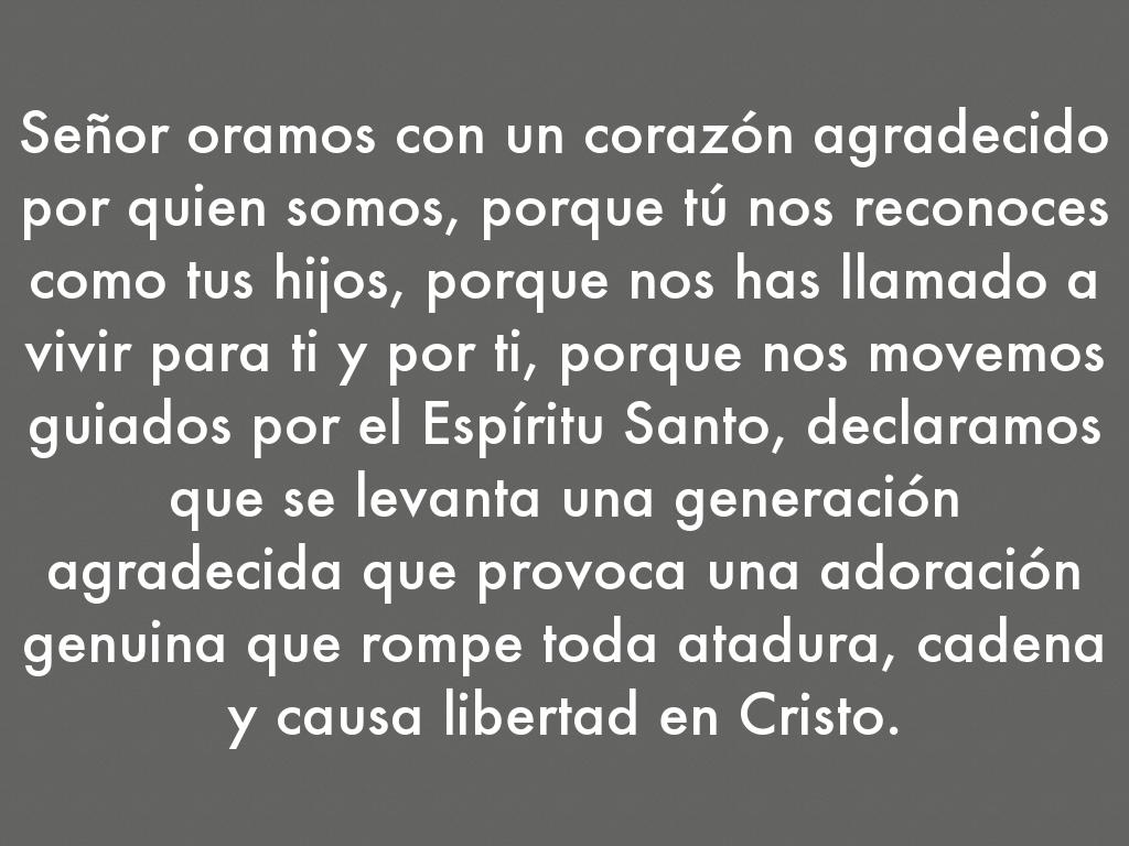 Señor oramos con un corazón agradecido por quien somos, porque tú nos reconoces como tus hijos, porque nos has llamado a vivir para ti y por ti, porque nos movemos guiados por el Espíritu Santo, declaramos que se levanta una generación agradecida que provoca una adoración genuina que rompe toda atadura, cadena y causa libertad en Cristo.