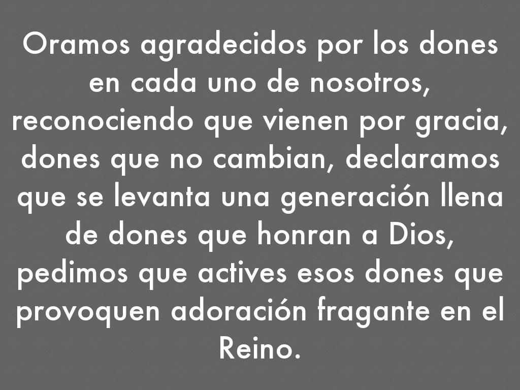 Oramos agradecidos por los dones en cada uno de nosotros, reconociendo que vienen por gracia, dones que no cambian, declaramos que se levanta una generación llena de dones que honran a Dios, pedimos que actives esos dones que provoquen adoración fragante en el Reino.