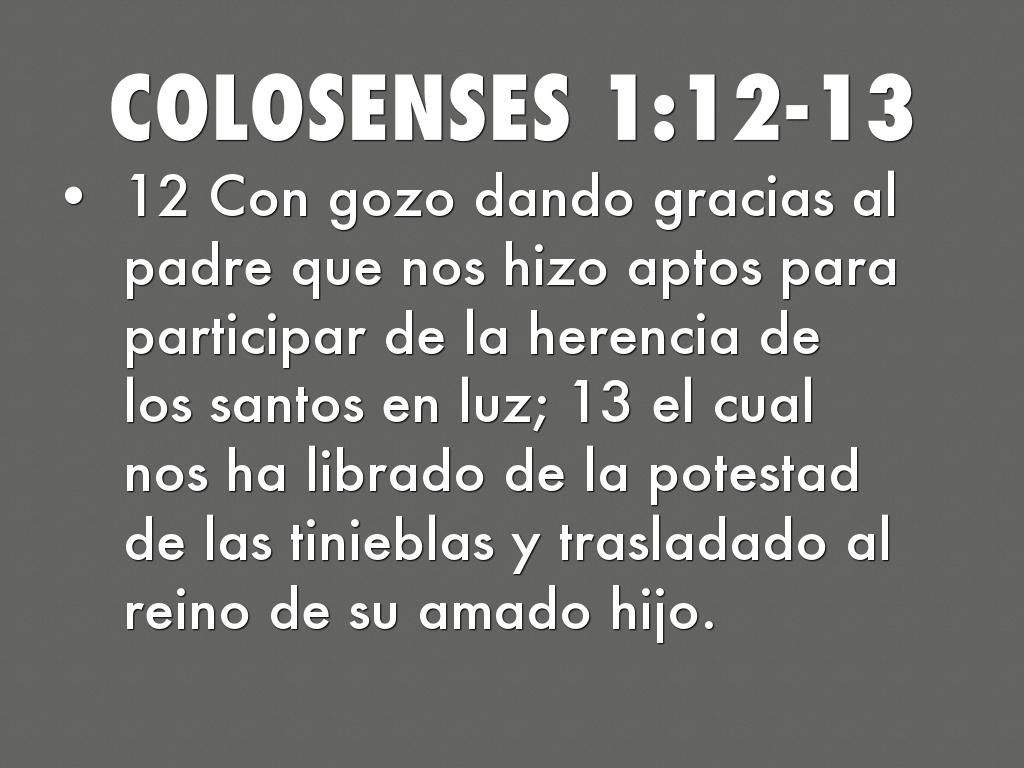 - 12 Con gozo dando gracias al padre que nos hizo aptos para participar de la herencia de los santos en luz; 13 el cual nos ha librado de la potestad de las tinieblas y trasladado al reino de su amado hijo.