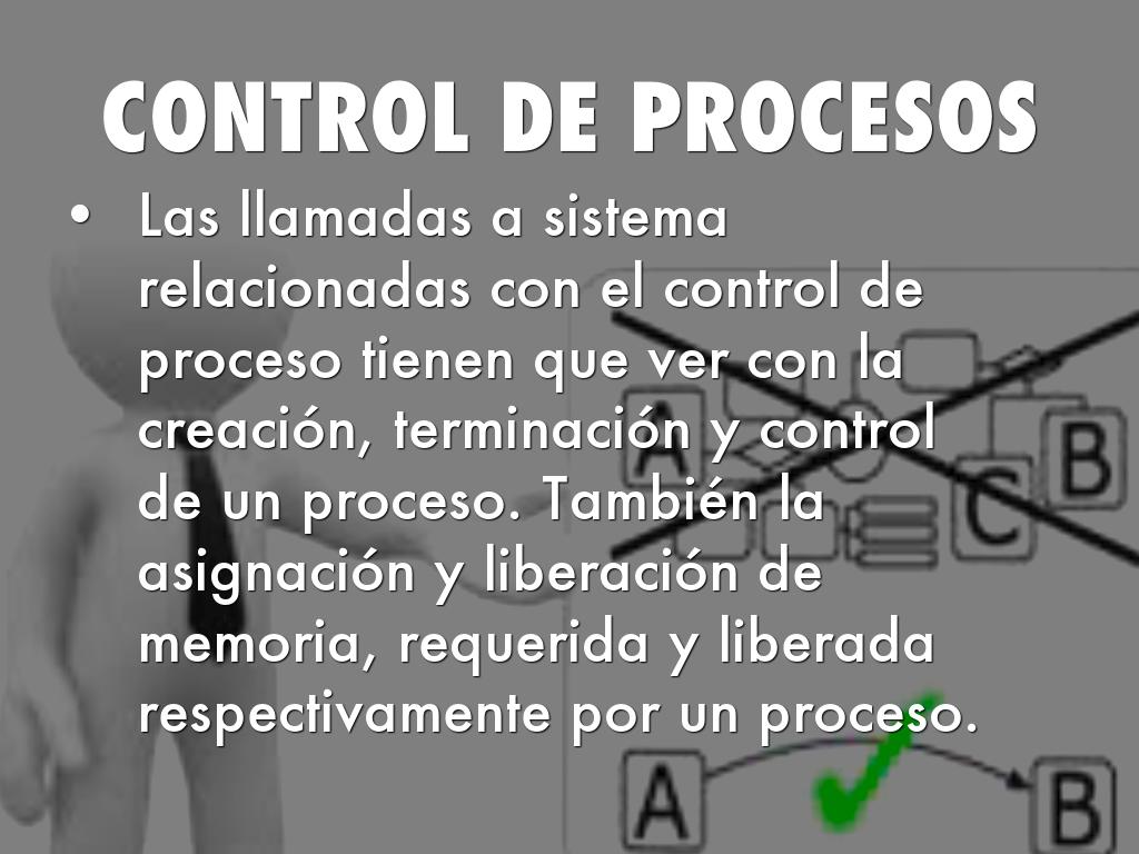Las llamadas a sistema relacionadas con el control de proceso tienen que ver con la creación, terminación y control de un proceso. También la asignación y liberación de memoria, requerida y liberada respectivamente por un proceso.