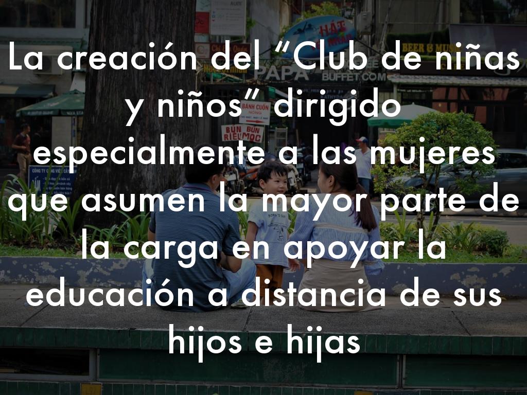 La creación del “Club de niñas y niños” dirigido especialmente a las mujeres que asumen la mayor parte de la carga en apoyar la educación a distancia de sus hijos e hijas