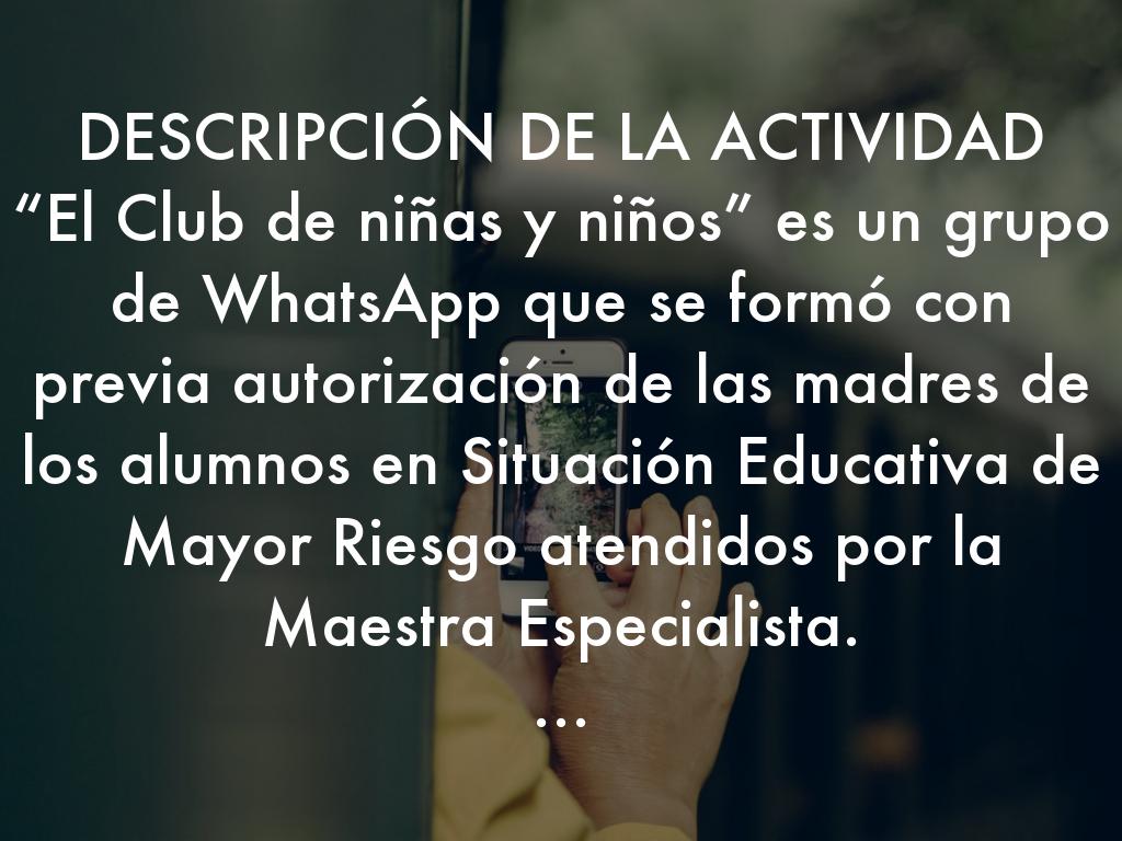 DESCRIPCIÓN DE LA ACTIVIDAD “El Club de niñas y niños” es un grupo de WhatsApp que se formó con previa autorización de las madres de los alumnos en Situación Educativa de Mayor Riesgo atendidos por la Maestra Especialista. …