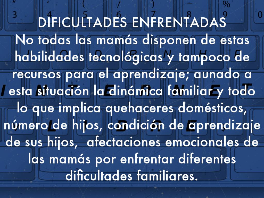 DIFICULTADES ENFRENTADAS No todas las mamás disponen de estas habilidades tecnológicas y tampoco de recursos para el aprendizaje; aunado a esta situación la dinámica familiar y todo lo que implica quehaceres domésticos, número de hijos, condición de aprendizaje de sus hijos, afectaciones emocionales de las mamás por enfrentar diferentes dificultades familiares.