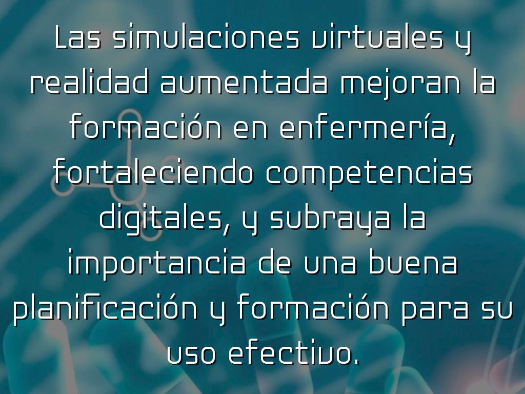 Las simulaciones virtuales y realidad aumentada mejoran la formación en enfermería, fortaleciendo competencias digitales, y subraya la importancia de una buena planificación y formación para su uso efectivo.