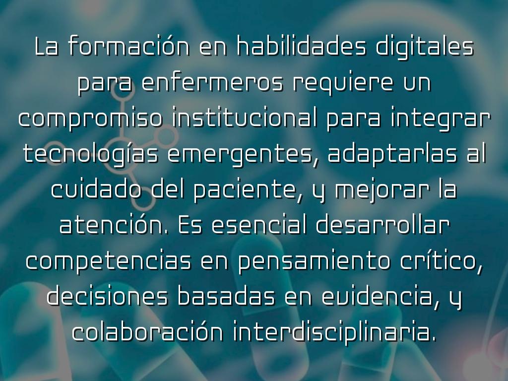 La formación en habilidades digitales para enfermeros requiere un compromiso institucional para integrar tecnologías emergentes, adaptarlas al cuidado del paciente, y mejorar la atención. Es esencial desarrollar competencias en pensamiento crítico, decisiones basadas en evidencia, y colaboración interdisciplinaria.