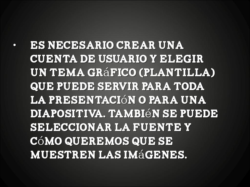 Es necesario crear una cuenta de usuario y elegir un tema gráfico (plantilla) que puede servir para toda la presentación o para una diapositiva. También se puede seleccionar la fuente y cómo queremos que se muestren las imágenes.