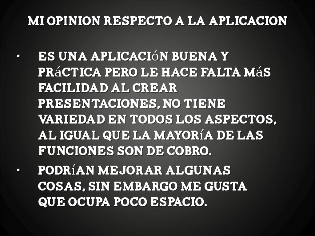 Es una aplicación buena y práctica pero le hace falta más facilidad al crear presentaciones, no tiene variedad en todos los aspectos, al igual que la mayoría de las funciones son de cobro.
