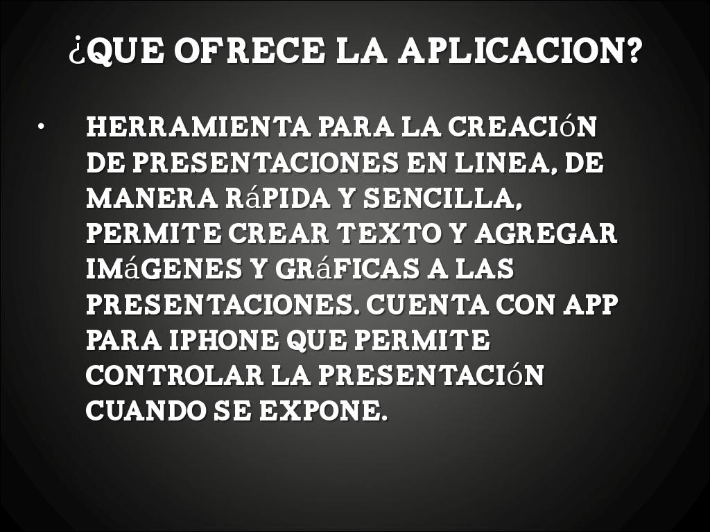 Herramienta para la creación de presentaciones en linea, de manera rápida y sencilla, permite crear texto y agregar imágenes y gráficas a las presentaciones. Cuenta con app para iphone que permite controlar la presentación cuando se expone.