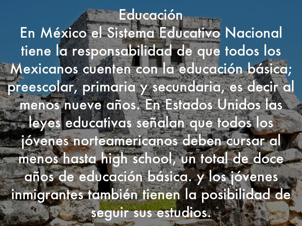 Educación En México el Sistema Educativo Nacional tiene la responsabilidad de que todos los Mexicanos cuenten con la educación básica; preescolar, primaria y secundaria, es decir al menos nueve años. En Estados Unidos las leyes educativas señalan que todos los jóvenes norteamericanos deben cursar al menos hasta high school, un total de doce años de educación básica. y los jóvenes inmigrantes también tienen la posibilidad de seguir sus estudios.