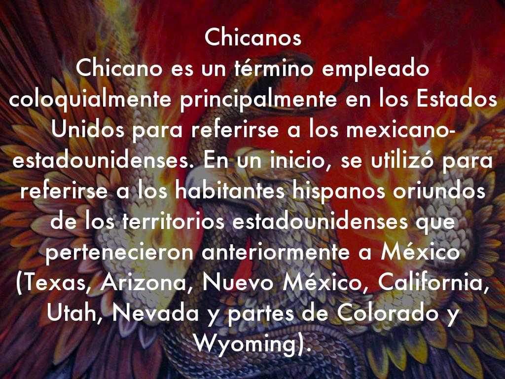 Chicanos Chicano es un término empleado coloquialmente principalmente en los Estados Unidos para referirse a los mexicano-estadounidenses. En un inicio, se utilizó para referirse a los habitantes hispanos oriundos de los territorios estadounidenses que pertenecieron anteriormente a México (Texas, Arizona, Nuevo México, California, Utah, Nevada y partes de Colorado y Wyoming).