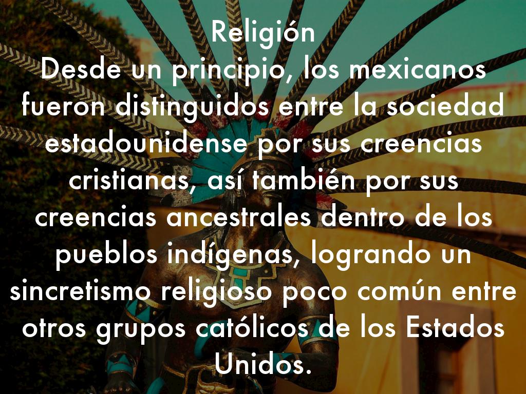 Religión Desde un principio, los mexicanos fueron distinguidos entre la sociedad estadounidense por sus creencias cristianas, así también por sus creencias ancestrales dentro de los pueblos indígenas, logrando un sincretismo religioso poco común entre otros grupos católicos de los Estados Unidos.