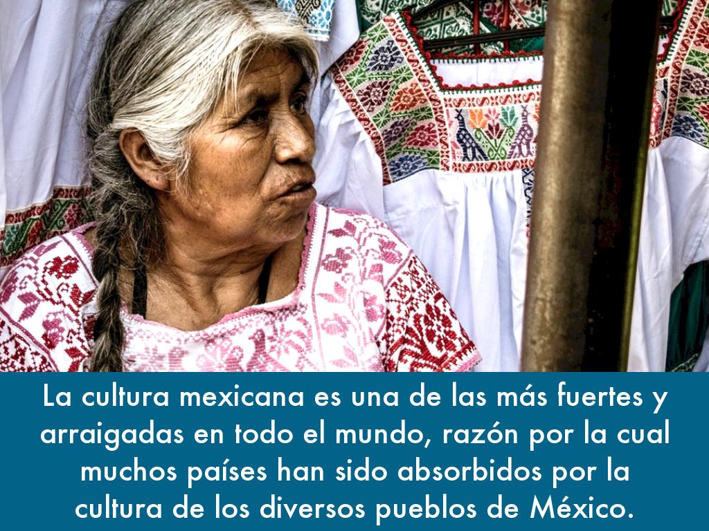 La cultura mexicana es una de las más fuertes y arraigadas en todo el mundo, razón por la cual muchos países han sido absorbidos por la cultura de los diversos pueblos de México.