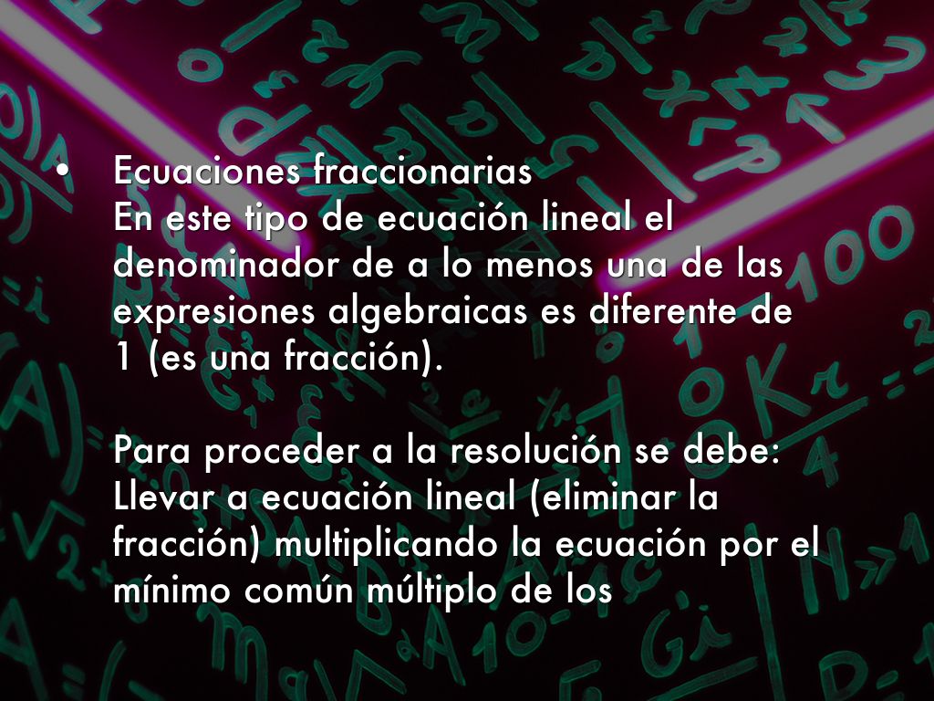 En este tipo de ecuación lineal el denominador de a lo menos una de las expresiones algebraicas es diferente de 1 (es una fracción).